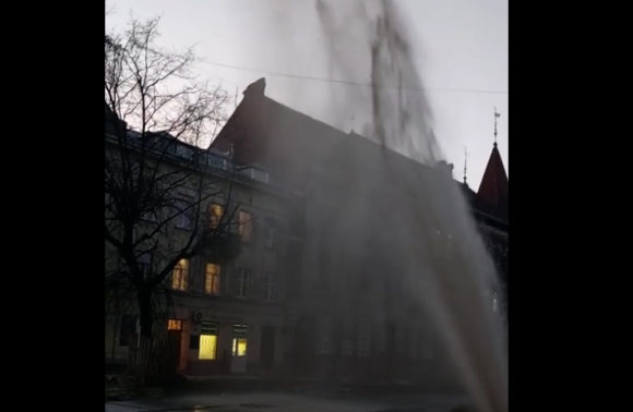 Сьогодні на вулиці Бандери у Львові, біля пам'ятника Степану Бандері, з-під земля піднявся водяний стовп.
