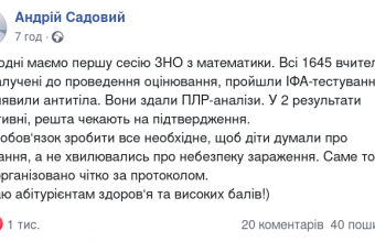 Про це повідомив міський голова Львова Андрій Садовий у Фейсбуці: "Сьогодні маємо першу сесію ЗНО з математики. Всі 1645 вчителів, які залучені до проведення оцінювання, пройшли ІФА-тестування. У 38 виявили антитіла. Вони здали ПЛР-аналізи. У 2 результати негативні, решта чекають на підтвердження.