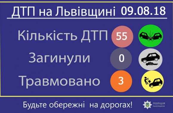 «У трьох ДТП троє людей отримали тілесні ушкодження т- пішохід, скутерист та мотоцикліст. За наслідками інших ДТП складено 52 адміністративних протоколів за статтею 124 (порушення правил дорожнього руху, що спричинило пошкодження транспортних засобів, вантажу, автомобільних доріг, вулиць, залізничних переїздів, дорожніх споруд чи іншого майна) Кодексу України про адміністративні правопорушення, яка передбачає накладення штрафу в розмірі двадцяти неоподатковуваних мінімумів доходів громадян або позбавлення права керування транспортними засобами на строк від шести місяців до одного року», – поінформували також у прес-службі Головного управління поліції у Львівській області.