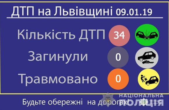 9 січня на автодорогах Львівської області сталися 34 дорожньо-транспортних пригоди, внаслідок яких ніхто не травмувався.