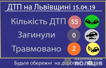 15 квітня на автодорогах Львівської області зареєстрували 55 дорожньо-транспортних пригод, дві з яких були з потерпілими – травмувалися двоє людей.