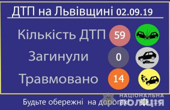 2 вересня на автомобільних дорогах Львівської області зареєстрували 59 дорожньо-транспортних пригод, дві з яких були з потерпілими – травмувалися чотирнадцять людей.