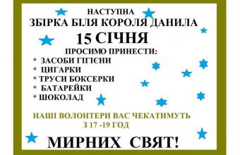Активісти громадської ініціативи «Допоможи фронту» повідомили вчора пізно ввечері, що сьогодні з 17.00 до 19.00 вони традиційно збиратимуть біля пам’ятника королю Данилу на площі Галицькій допомогу воїнам. Волонтери написали про це на своїй сторінці в інтернет-мережі «Facebook», де вони також опублікували ілюстрацію, на якій вказано те, що збиратимуть сьогодні.