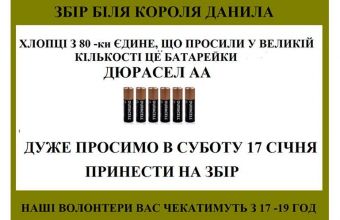 Активісти громадської ініціативи «Допоможи фронту» повідомили, що сьогодні, 17 січня, вони традиційно чекатимуть патріотів України біля пам'ятника королю Данилу на площі Галицькій зі 17:00 до 19:00. Цього разу – з батарейками «Duracell АА», які просили десантники 80-ї окремої аеромобільної бригади зі Львова. Волонтери повідомили про це на своїй сторінці в інтернет-мережі «Facebook».