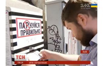 «Урок правильного паркування. У середмісті Львова встановили антипаркомат - пристрій, який безкоштовно видає спеціальні наліпки. На них заклики до водіїв так залишати своє авто, щоб воно не заважало пішоходам і велосипедистам.
