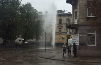 Вода здіймається догори на розі вулиць Замарстиніської й Ткацької.