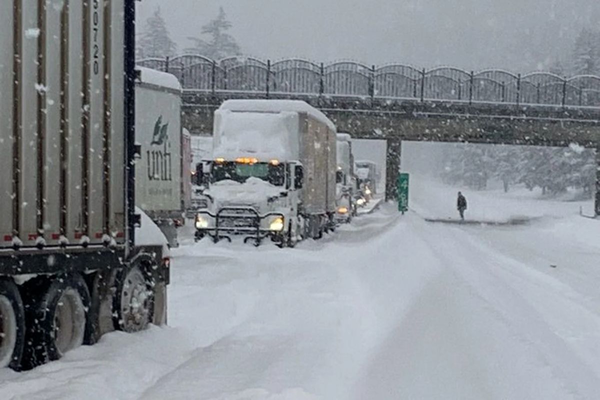 Шар снігу та льоду зірвався з даху причепа вантажівки та впав прямо перед поліційним автомобілем.
