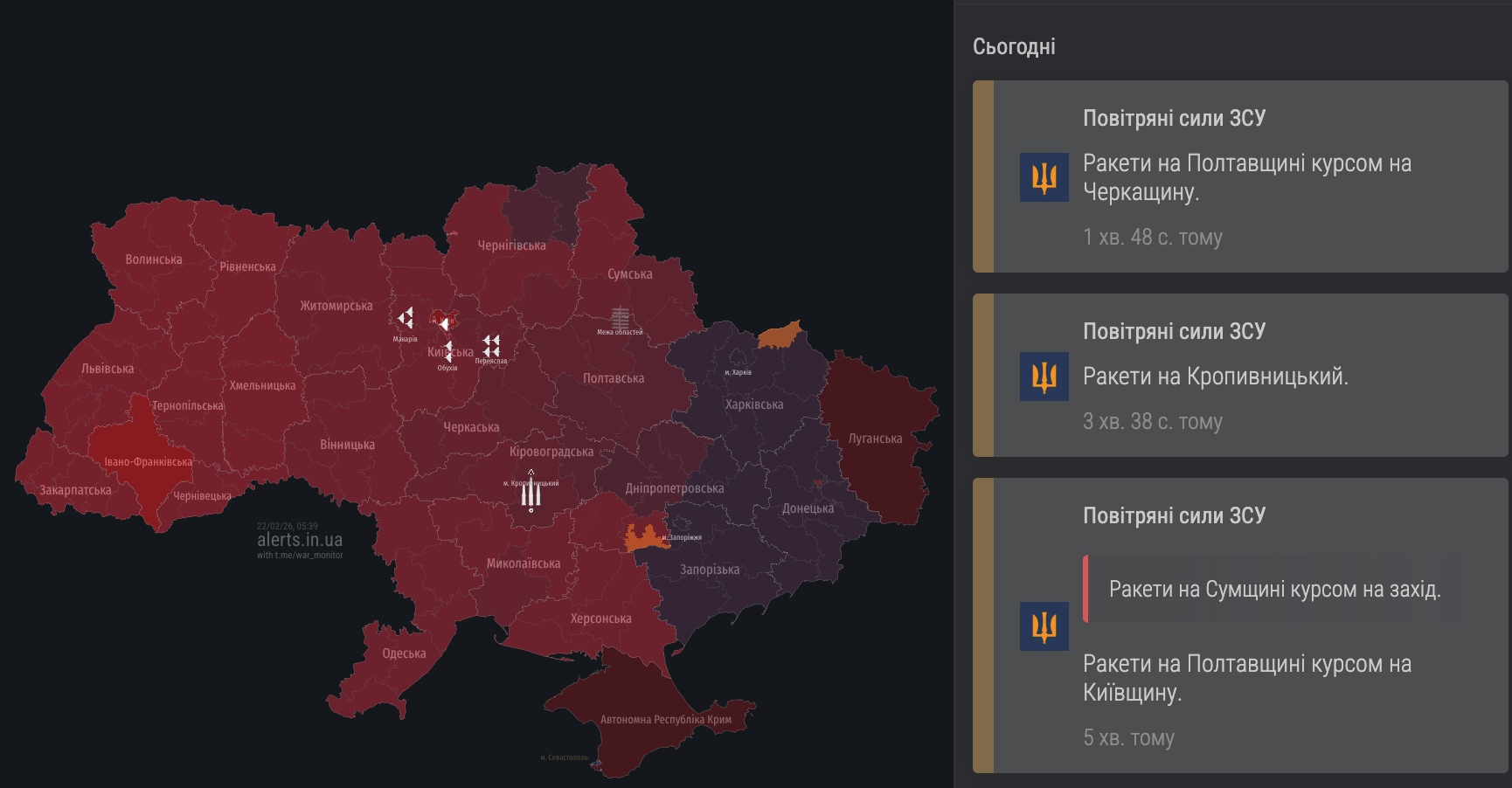 В усій Україні триває повітряна тривога через масовану комбіновану російську атаку ударними безпілотниками і ракетами різних типів.