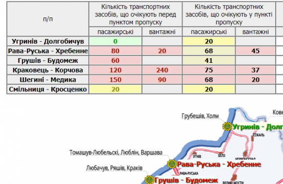 400 транспортних засобів очікують у прикордонних автомобільних пунктах пропуску на Львівщині, а ще 780 скупчилися перед ними.