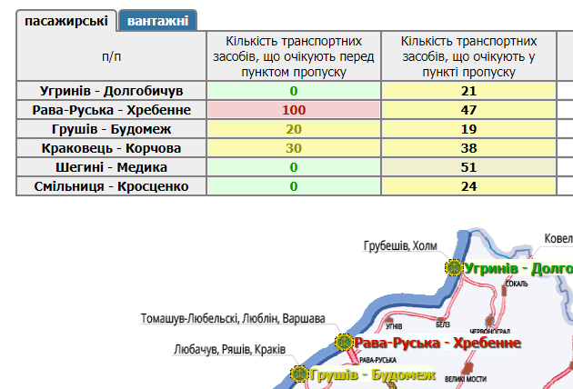 200 транспортних засобів очікують у прикордонних автомобільних пунктах пропуску на Львівщині, а ще 150 скупчилися перед ними.