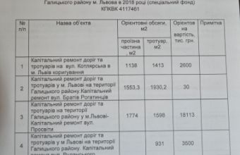 «Зокрема, Галицька районна адміністрація затверджувала міжквартальні дороги, які вони будуть робити у 2018 році. Це ремонтні роботи на вулицях Котлярській, Братів Рогатинців, Просвіти, Рутковича та інші. З цікавих об’єктів – це фонтани, які ремонтуватимуть в центрі міста: фонтан «Кульбаба», фонтан «Водолій.