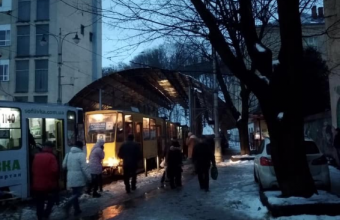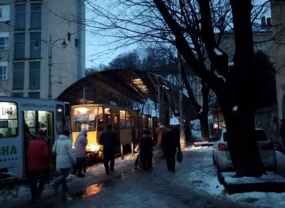 Трамваї простоюють на вулиці Дорошенка у Львові.