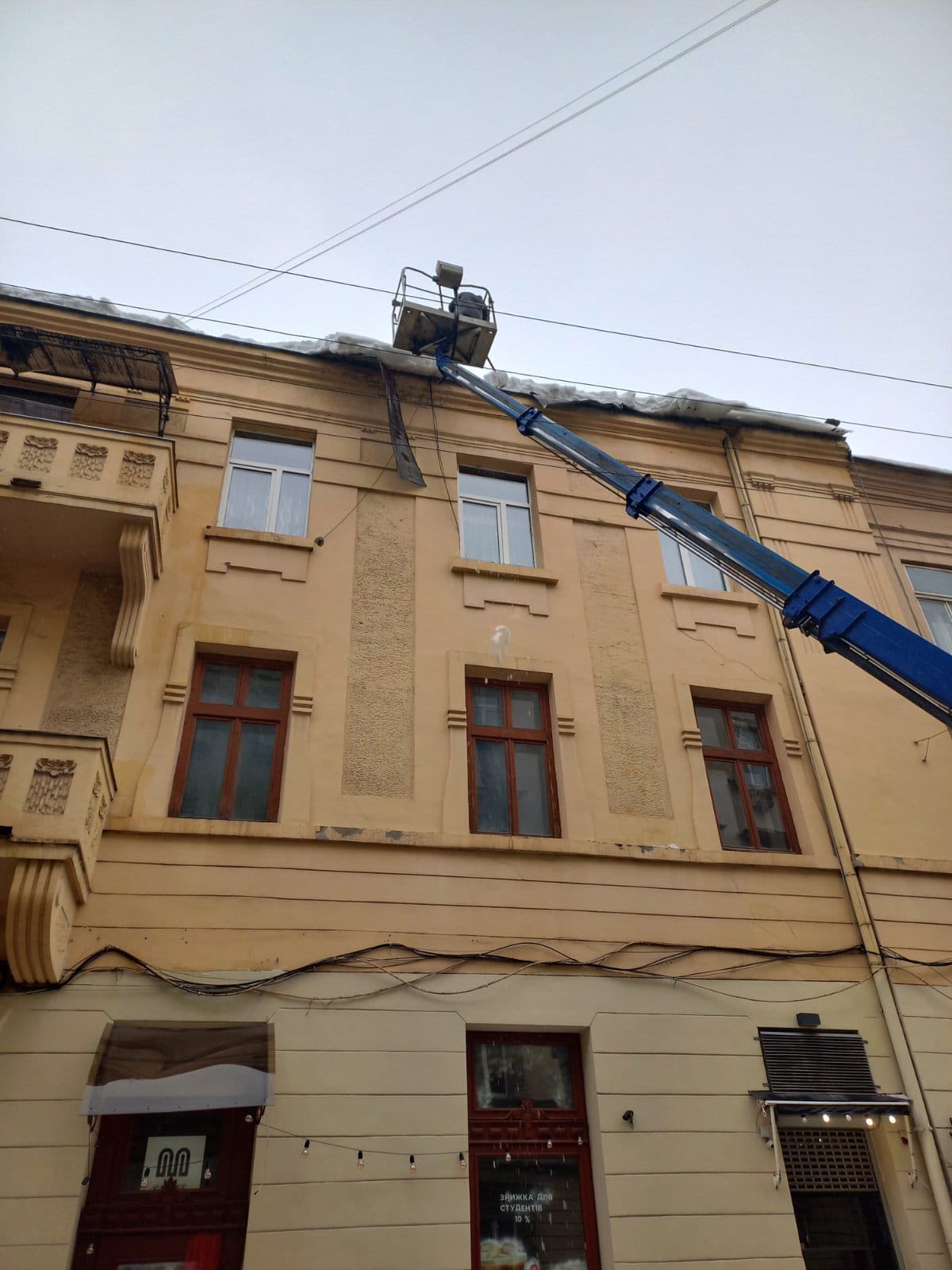 "Працівники ЛМКП «Айсберг» оперативно відреагували: за допомогою автовишки очистили дах від снігу та прибрали навислу бляху, яка становила небезпеку для перехожих і майна.