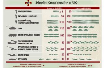 Прес-служба Генерального штабу Збройних Сил України опублікувала сьогодні, 2 вересня, інформаційне повідомлення про те, що зі серпня минулого року кількість бійців ЗСУ в зоні проведення антитерористичної операції зросла з 32 тисяч до 73 тисяч, бригад і полків – з восьми до 25-ти, батальйонів і дивізіонів – з 50-ти до 150-ти, танків – з 210-ти до 360-ти; бронемашин – з 900 до 1400; реактивних систем залпового вогню – з 80-ти до 230-ти; артилерійських систем та мінометів калібром більше 100 міліметрів – з 450-ти до 800, бойових літаків – з 20-ти до 40 одиниць. І лише кількість вертольотів не змінилася – 30 машин. Про це повідомляється в середу на сторінці прес-служби Генерального штабу Збройних Сил України в інтернет-мережі «Facebook».