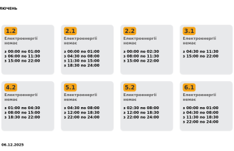Група 5.1. Електроенергії немає з 04:30 до 08:00, з 12:00 до 18:30, з 22:00 до 24:00.