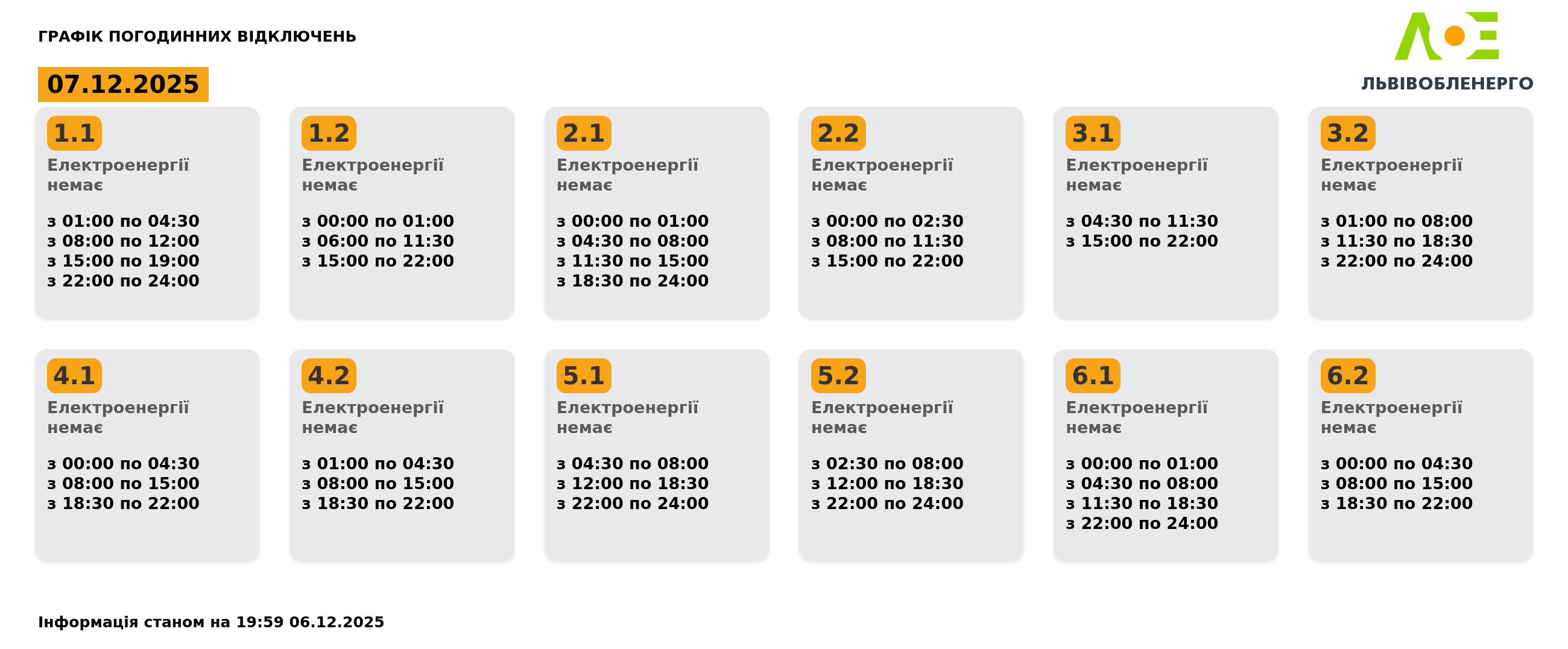 Група 1.2. Електроенергії немає з 00:00 до 01:00, з 06:00 до 11:30, з 15:00 до 22:00.