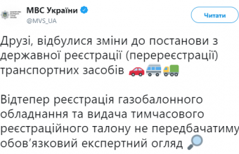 Про це повідомили в понеділок, 17 грудня, в прес-службі прес-служба МВС України. Відтепер реєстрація газобалонного обладнання та видача тимчасового реєстраційного талону під час передачі права користування авто не передбачатимуть обов’язковий експертний огляд. Крім того, огляд не треба проводити при реєстрації нових транспортних засобів, вибракуванні авто та перереєстрації машини у зв’язку зі зміною анкетних даних, місця проживання власника.