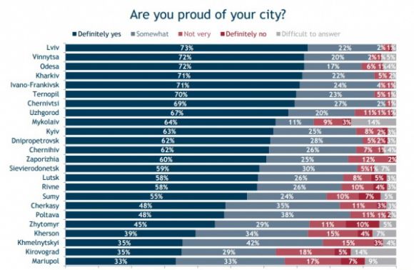 «Найбільше своїм містом задоволені львів'яни (73%), вінничани (72%), одесити (72%), харків'яни та івано-франківці (71%), а також тернополяни (70%). Ці дані наводить дослідження, здійснене на замовлення уряду Канади.