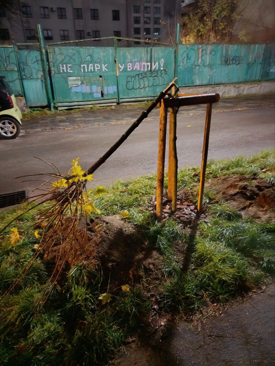 Кількома годинами раніше львів'янка розмістила у Facebook фото і розповіла, що вона, чоловік і троє їхніх дітей висадили у Львові на вулиці Зерова кулястий клен. Щобільше, висловила сподівання, що його не вкрадуть і не знищать.