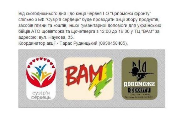 «Від сьогоднішнього дня і до кінця червня ГО «Допоможи фронту» спільно з БФ «Сузір'я сердець» буде проводити акції збору продуктів, засобів гігієни та коштів, іншої гуманітарної допомоги для українських бійців АТО щовівторка та щочетверга з 12:00 до 19:30 у ТЦ «ВАМ» за адресою: вул. Наукова, 35. Координатор акції – Тарас Рудницький (0938458405)», – повідомили сьогодні, 30 квітня, на сторінці ГО «Допоможи фронту» в інтернет-мережі «Facebook».