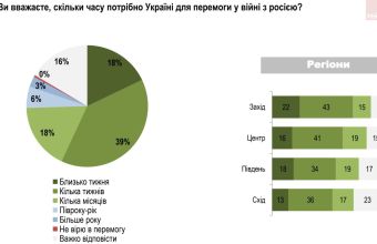 Тих, хто взагалі не вірить в перемогу, майже немає. 16% не змогли відповісти на це питання. Найбільш оптимістично налаштовані мешканці західного регіону, але і в інших областях більшість вірить, що війна триватиме недовго.