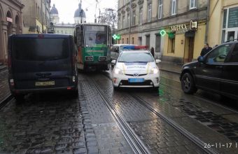 Електротранспорт простоює на вулиці Хмельницького через те, що автомобіль припаркований впритул до колії.