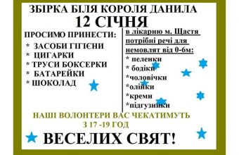 «У звязку зі святами – наступна збірка біля короля Данила відбудеться в понеділок, 12 січня 2015 року!!! Дуже просимо принести дитячі речі для немовлят – 0-6 місяців – в лікарні в міста Щастя (в Новоайдарському районі Луганщини. – «ЩЛ»).