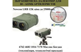 Громадська ініціатива «Допоможи Фронту» на звернення (хоч важко це назвати зверненням – це просто крик душі) артилеристів 80-ї аеромобільної бригади, ПРОСИТЬ всіх друзів, бізнесменів, українські діаспори в світі, небайдужих громадян і патріотів своєї Держави долучитися до збору коштів для придбання 12-тикілометрового ДАЛЕКОМІРА «Newcon LRB 12K». Це не просто дорогий прилад. Це прилад, який допоможе врятувати тисячі життів українських захисників та мирних мешканців на сході країни, адже наша артилерія зможе працювати на випередження.