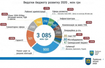 Про це повідомили в четвер, 19 грудня, у Львівській міськраді. Директорка департаменту економічного розвитку ЛМР Ірина Кулинич зазначила на засіданні виконавчого комітету: «Загальна сума видатків бюджету розвитку у 2020 році у нас буде три мільярди 85 мільйонів і до розподілу по об’єктах становитиме один мільярд 873 мільйонів. Якщо проаналізувати бюджет розвитку 2019 року, то це в загальній сумі три мільярди 68 мільйонів. Тобто ми можемо говорити про те, що бюджет розвитку, який ми виноситимемо на засідання сесії Львівської міської ради, перевищує той, що був у 2019 році».