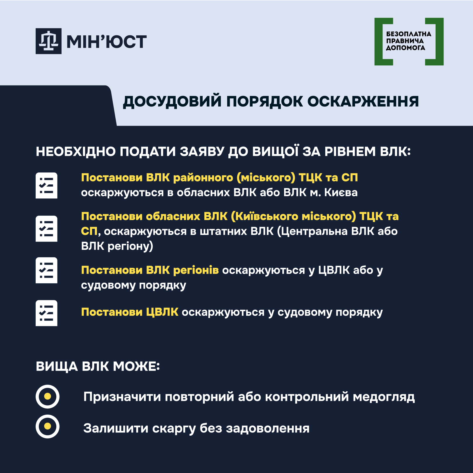 - постанови ВЛК районного (міського) територіального центру комплектування та соціальної (ТЦК та СП) оскаржуються в обласних ВЛК або ВЛК м. Києва;
