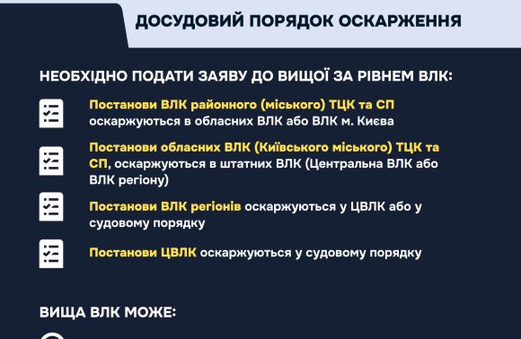 - постанови обласних ВЛК (Київського міського) ТЦК та СП, оскаржуються в штатних ВЛК (Центральна ВЛК або ВЛК регіону);