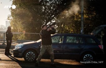 Фотограф AFP зафіксував момент, коли дрони летіли низько небом Києва і поліцейські обстрілювали їх з землі.