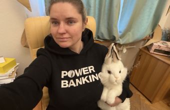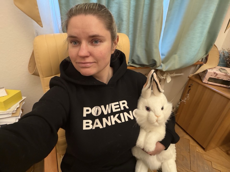 Мій одяг в Офіс – товстенна худі-фліска Power Banking від НБУ (дякую колегам за цей подарунок ще 2022 року), військова термобілизна та шкіряни штани. Але кінцівки та ніс все рівно дуже мерзнуть – мабуть ми з Петею – брат із сестрою, то ж гріюсь, встромляючи носа в м’яку іграшку – Лапін (кролик фр.)", - пояснила ситуацію Вікторія Страхова.