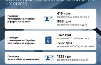 Про це повідомляє Державна міграційна служба, пише DailyLviv.com. З 1 січня 2026 року ДП «Поліграфічний комбінат «Україна» змінило вартість бланків окремих біометричних документів. У зв'язку з цим зростала і загальна вартість оформлення паспорта громадянина України у формі ID-картки, паспорта громадянина України для виїзду за кордон, а також посвідок на тимчасове та постійне проживання в Україні.