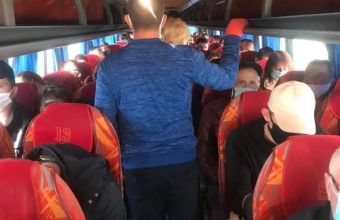 Автобуси перевозять людей через нейтральну смугу до найближчої АЗС, де стоїть поліція з лікарями, а також інші автобуси, які після проведення медиками тестів на коронавірус, розвозять людей далі.