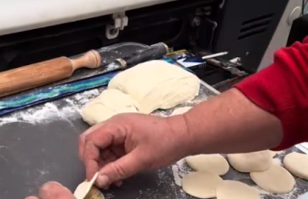 На відео кремезний водій потужної вантажівки вправно ліпить вареники для своїх колег по керму і пригощає ними журналістів.
