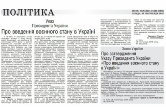 У середу, 28 листопада, на сайті видання офіційної газети Верховної Ради «Голос України» публіковано її спеціальний випуск №226 із текстом закону про затвердження указу президента України «Про введення воєнного стану в Україні» і постанови парламенту «Про призначення чергових виборів президента України. Зокрема, в тексті закону «Про затвердження указу президента України «Про введення воєнного стану в Україні» йдеться: «Цей закон негайно оголошується через засоби масової інформації та вступає в дію з дня його опублікування».