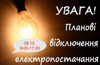 28 грудня в електромережах заплановані відключення електроенергії для проведення ремонтних робіт, орієнтовний час з 8:00 до 17:00.