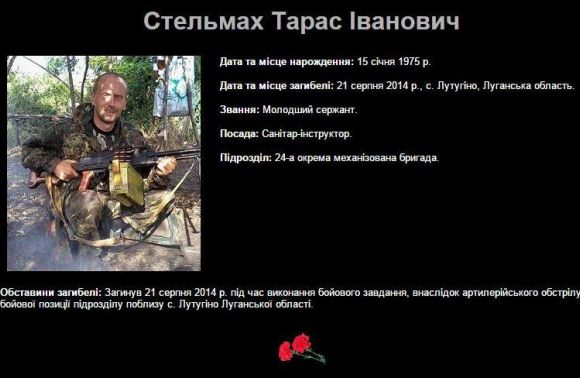 Тарас Стельмах народився 15 січня 1975 року, помер 7 серпня 2014 року. Був молодшим сержантом, санітаром 24 окремої механізованої бригади.