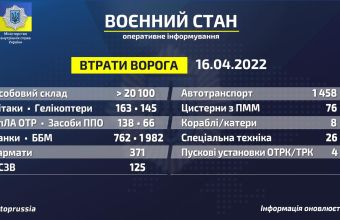 Про оперативну інформацію від Генерального Штабу Збройних Сил України станом на 18.00 16.04.2022 щодо російського вторгнення пише Dailylviv.com.