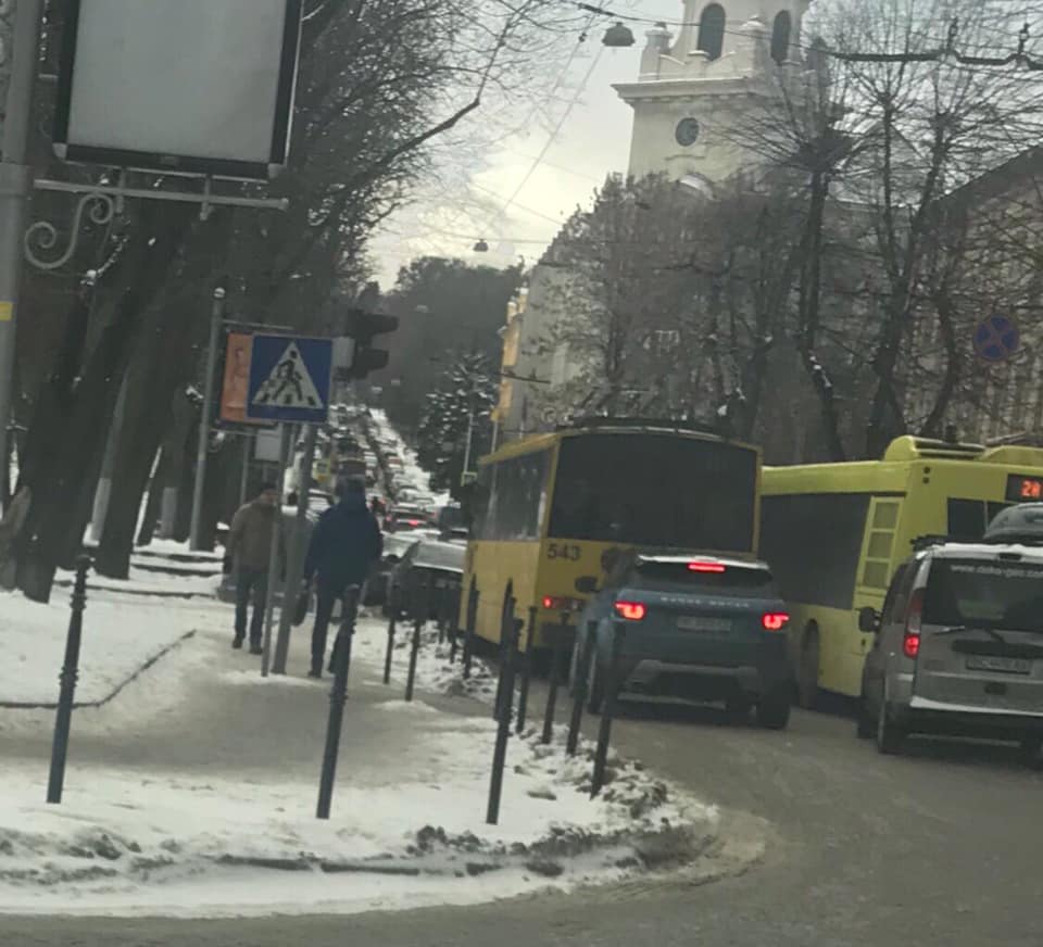 Транспортні засоби простоюють на площі Генерала Григоренка у Львові через зіткнення автобуса й тролейбуса.