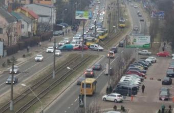 У вівторок, 26 лютого, на вулиці Княгині Ольги сталося зіткнення автомобілів на трамвайній колії.