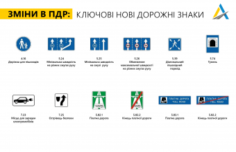 З'являться нові дорожні знаки: житлової зони, пішохідної доріжки, початку населеного пункту і його закінчення, напрямки повороту, місця дозволеної зупинки та стоянки, заборони руху транспортних засобів та інші.