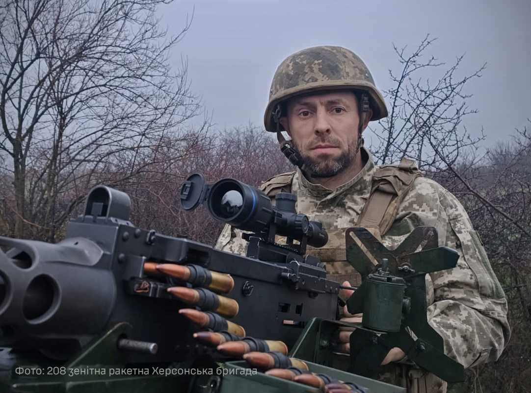 На світлині: Сергій — кулеметник мобільної вогневої групи, яка виконує бойові завдання у складі 208 зенітної ракетної Херсонської бригади. У ніч на 20 грудня захисник неба збив над Миколаївщиною три ворожі ударні безпілотники типу «Shahed».