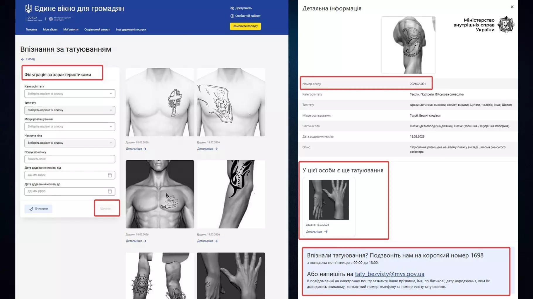 Міністерство внутрішніх справ України повідомило, пише DailyLviv.com, що запускає новий онлайн-розділ «Впізнання за татуюванням» на порталі «Єдине вікно для громадян». Його створено для сприяння ідентифікації осіб, зниклих безвісти за особливих обставин.